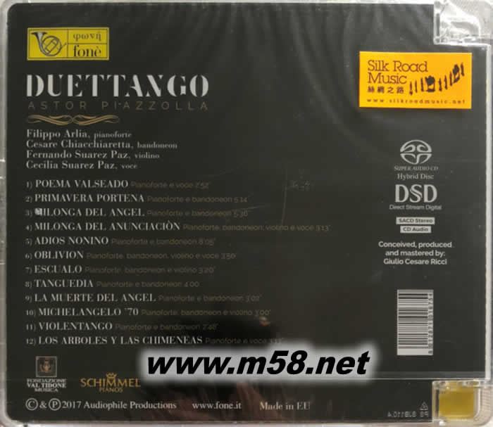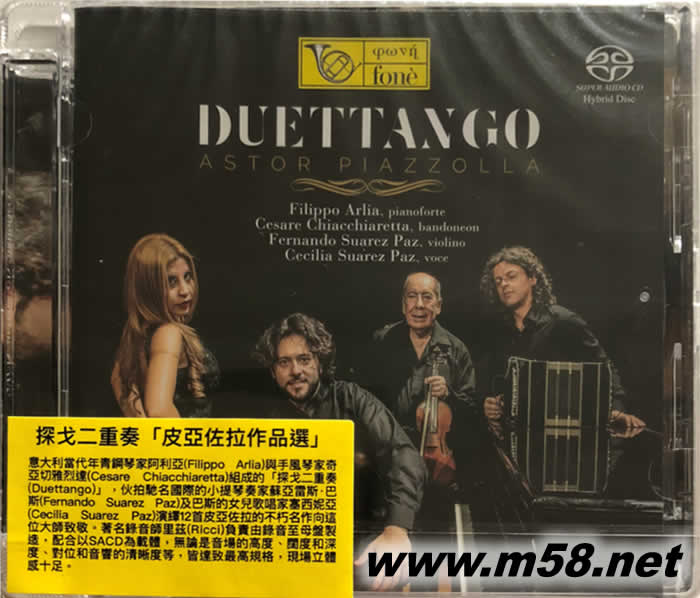 探戈二重奏[皮亞佐拉作品選]Duettango [Astor Piazzolla] 鋼琴+小提琴+手風琴+女聲SACD(m58.net) Filippo Arlia(鋼琴) Fernando Suarez Paz(小提琴) Cesare Chiacchiaretta(手風琴) Cecilia Suarez Paz(女聲) 向皮亞佐拉致敬集,十二首的不朽名作 鋼琴+小提琴+手風琴+女聲 將皮亞佐拉的作品以最接近原貌重現, 越聽越有味道 1. 意大利當代年青鋼琴家菲利普•阿利亞(Filippo Arlia)與手風琴家切薩雷•奇亞切雅烈達(Cesare Chiacchiaretta)於2008年成立二人組合「探戈二重奏(Duettango)」,他倆利用各自擅長的樂器致力探索和推廣探戈音樂,特別是探戈圖騰皮亞佐拉(Astor Piazzolla)的作品,他們如對話般的演奏別樹一格,可圈可點,贏得不少喝采聲。 2. 他倆伙拍馳名國際的小提琴奏家費爾南多•蘇亞雷斯•巴斯(Fernando Suarez Paz)及巴斯的女兒歌唱家塞西妮亞(Cecilia Suarez Paz)演繹十二首皮亞佐拉的不朽名作向這位大師致敬。 3. 阿利亞的鋼琴鏗鏘俐落配合奇亞切雅烈達矯揉圓滑的手風琴和巴斯輕鬆自然,線條分眀的小提琴演奏,加上塞西妮亞那磁性帶點沙唖卻充滿拉丁口味的歌唱,將皮亞佐拉的作品以最接近原貌重現,越聽越有味道。 4. LP : 著名錄音師里茲(Giulio Cesare Ricci)負責由錄音至母盤製造和壓片工序整個過程期間不作任何加強、調整和更改(one-stage pressing process),是純自然的模擬錄音(pure analogue natural sound recording)。在德國壓製的33轉180克處女黑膠唱片,全球限量出版496張,是聆聽另一名盤。 5. SACD : 著名錄音師里茲(Giulio Cesare Ricci)負責由錄音至母盤製造,配合以SACD為載體,無論是音場的高度、闊度和深度、對位和音響的清晰度等,皆達致最高規格,現場立體感十足,是獨一無二的鑑賞名盤。