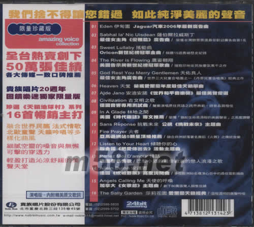 1.Eden 伊甸園 (Jaguar汽車2006年最新廣告曲) 2.Sabhal Ia’Nic Uisdean 薩伯爾拉威斯丁 (最佳女主角《優(yōu)雅篇》廣告曲 / 榮獲臺灣聽眾票選最受歡迎廣告曲第1名) 3.Sweet Lullaby 搖籃曲 (Oricon新世紀(jì)榜冠軍金曲 / 稱霸15周勇破歷史紀(jì)錄) 4.The River is Flowing 鷹姿翱翔 (美國告示牌新世紀(jì)榜冠軍歌曲 / 描寫印地安民族豪氣萬千之作) 5.God Rest You Merry Gentlemen 天佑良人 (最佳女主角廣告曲 / 世界三大兒童合唱團之一《丹麥兒童合唱團》經(jīng)典之作) 6.Heaven 天堂 (榮獲愛爾蘭年度最佳天籟單曲) 7.Ajde Jano 安迪安諾 (《世界和平音樂獎》最佳美聲優(yōu)選) 8.Civilization 古文明之歌 (德國音響專用測試曲 / 聲樂演唱原住民語之跨界典范,錄音品質(zhì)極佳) 9.In A Glade 林地之間 (美國《時代雜志》專文推薦 / 榮獲“猶如生命泉源般的美麗聲音”之高度贊譽) 10.Sans Reponse 挑戰(zhàn)未來 (公視《挑戰(zhàn)未來》主題曲) 11.Fire Prayer 火者 (亞馬遜網(wǎng)站5顆星頂級推薦 / 融合非洲部落著名舞蹈《火舞》之傳統(tǒng)音樂) 12.Listen to Your Heart 傾聽你的心 (聯(lián)合國《把愛傳出去》活動主題曲) 13.Parlez Moi D’amour 情話 (法國著名情歌 / 巴黎小酒館最受歡迎的戀人浪漫之歌) 14.Ailein Duinn 安連恩 (法國《坎城影展》高度詢問曲 / 多位歐洲知名導(dǎo)演心目中的最佳電影插曲) 15.Angels Calling Me 天使的呼喚 (加拿大《女歌節(jié)》主題曲 / 創(chuàng)下80萬張驚人銷售佳績) 16.The Sally Garden 莎莉花園 (愛爾蘭天籟經(jīng)典 / 溫暖透明的美聲吟唱)