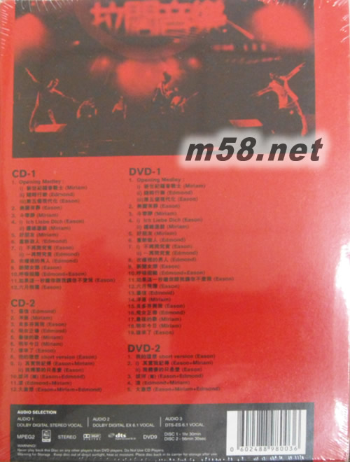DVD 1 1. Opening Medley : i) 新世紀福音戰士(Miriam) ii) 隨時行樂(Edmond) iii) 第五個現代化(Eason) 2. 美麗有罪(Eason) 3. 斗零踭(Miriam) 4. i) Ich Liebe Dich (Eason) ii) 纏綿游戲(Miriam) 5. 好朋友(Miriam) 6. 重新做人(Edmond) 7. i) 不再問究竟(Eason) ii) 一再問究竟(Edmond) 8. 衣柜里的男人(Edmond) 9. 新聞女郎(Eason) 10. 呼吸困難(Edmond+Eason) 11. 如果這一秒鐘你跟我講你不愛我 (Eason) 12. 六月飛霜(Eason) 13. 傷信(Edmond) 14. 洋蔥(Miriam) 15. 貝多芬與我(Eason) 16. 飛女正傳(Edmond) 17. 最后的歌(Miriam) 18. 明年今日(Miriam) 19. 狼來了(Eason) DVD 2 1. 我的理想short version (Eason) 2. i) 其實我記得(Eason+Miriam) ii) 我需要的只是愛(Eason+Miriam) 3. 拔河(國) (Eason+Edmond) 4. 滾(Edmond+Miriam) 5. 大激想(Eason+Miriam+Edmond) CD 1 1. Opening Medley : i) 新世紀福音戰士(Miriam) ii) 隨時行樂(Edmond) iii) 第五個現代化(Eason) 2. 美麗有罪(Eason) 3. 斗零踭(Miriam) 4. i) Ich Liebe Dich (Eason) ii) 纏綿游戲(Miriam) 5. 好朋友(Miriam) 6.. 重新做人(Edmond) 7. i) 不再問究竟(Eason) ii) 一再問究竟(Edmond) 8. 衣柜里的男人(Edmond) 9. 新聞女郎(Eason) 10. 呼吸困難(Edmond+Eason) 11. 如果這一秒鐘你跟我講你不愛我 (Eason) 12. 六月飛霜(Eason) CD 2 1. 傷信(Edmond) 2. 洋蔥(Miriam) 3. 貝多芬與我(Eason) 4. 飛女正傳(Edmond) 5. 最后的歌(Miriam) 6. 明年今日(Miriam) 7. 狼來了(Eason) 8. 我的理想short version (Eason) 9. i) 其實我記得(Eason+Miriam) ii) 我需要的只是愛(Eason+Miriam) 10. 拔河(國) (Eason+Edmond) 11. 滾(Edmond+Miriam) 12. 大激想(Eason+Miriam+Edmond)