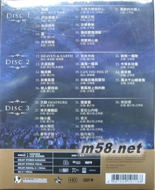 DVD 1 01. 陰陽 (YIN YANG) [contains the songs "Hinata vs Neiji" and "Dance"] - 演出: 喜多郎 雅樂團 02. 同途萬里人 - 主唱: 鄭少秋 03. 似水流年 - 主唱: 汪明荃 04. 星 - 主唱: 鄭少秋 05. 月兒彎彎 - 主唱: 汪明荃 06. 月亮代表我的心 - 合唱: 鄭少秋,汪明荃 07. 傾城之戀 - 主唱: 汪明荃 08. 京華春夢 - 主唱: 汪明荃 09. 像白云像清風(fēng) - 主唱: 汪明荃 10. 用愛將心偷 - 主唱: 汪明荃 11. 勇敢的中國人 - 主唱: 汪明荃 DVD 2 12. Heaven & Earth - 演出: 喜多郎 雅樂團 13. 天涯孤客 - 主唱: 鄭少秋 14. 輪流轉(zhuǎn) - 主唱: 鄭少秋 15. 笑看風(fēng)云 - 主唱: 鄭少秋 16. 做人愛自由 - 主唱: 鄭少秋 17. 在水中央 - 主唱: 鄭少秋 18. 滄海一聲笑 - 主唱: 鄭少秋 19. Can You Feel It - 演出: 雅樂團 20. 玫瑰玫瑰我愛你 - 主唱: 汪明荃 21. 春風(fēng)吻上我的臉 - 主唱: 汪明荃 22. 給我一個吻 - 主唱: 汪明荃 23. 今宵多珍重 - 主唱: 汪明荃 24. 夜來香 - 主唱: 汪明荃 25. 萬水千山總是情 - 主唱: 汪明荃 DVD 3 26. 太鼓 (Matsuri) - 演出: 喜多郎 27. 倚天屠龍記 - 主唱: 鄭少秋 28. 陸小鳳 - 主唱: 鄭少秋 29. 峰火飛花 - 主唱: 鄭少秋 30. 黃帝子孫 - 主唱: 鄭少秋 31. 楚留香 - 主唱: 鄭少秋 32. 愛在心內(nèi)暖 - 合唱: 鄭少秋,汪明荃 33. 香夭 - 合唱: 鄭少秋,汪明荃 34. 友情樂章 - 合唱: 鄭少秋,汪明荃 35. 圓月彎刀 - 合唱: 鄭少秋,汪明荃 36. 紫釵恨 - 合唱: 鄭少秋,汪明荃