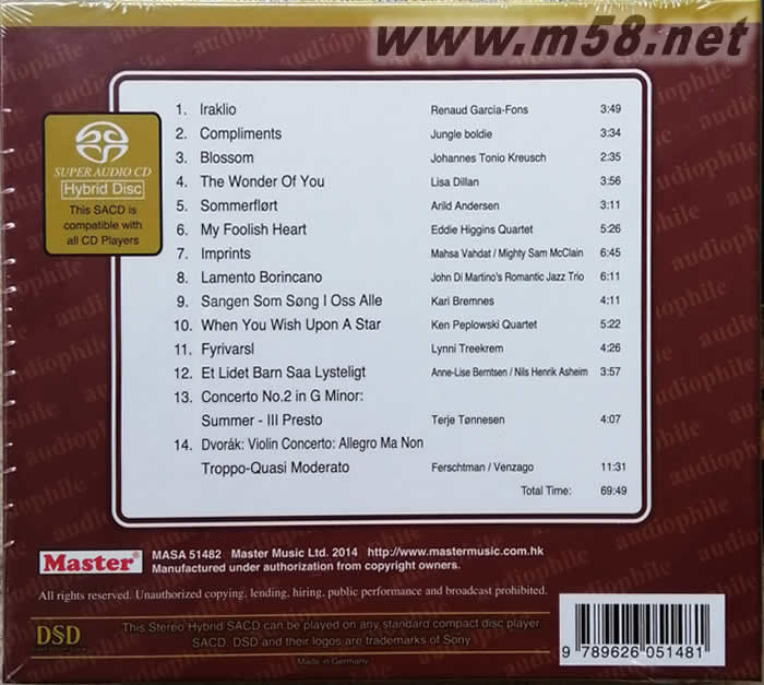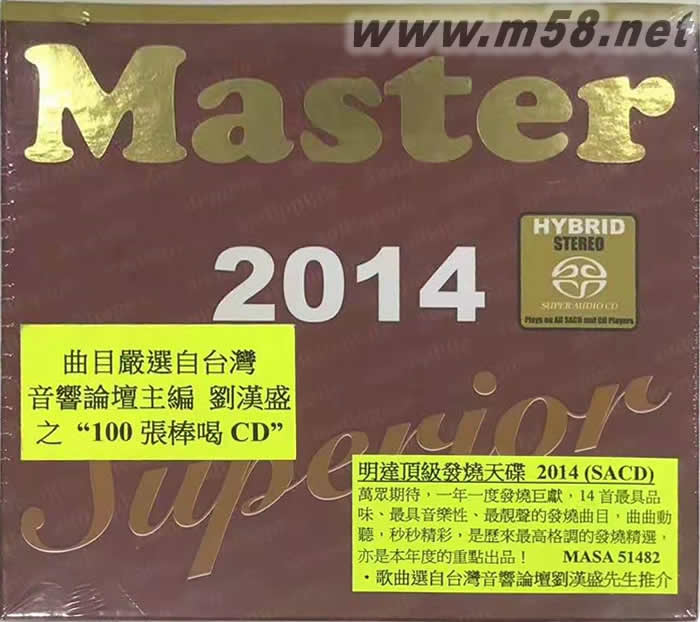 明達(dá)頂級(jí)發(fā)燒精選 MASTER SUPERIOR 2014 SACD 劉漢盛推介(m58.net) Master一年一度巨獻(xiàn),旗下代理唱片十四首包含古典、流行、爵士、探戈、新世紀(jì)音樂、藍(lán)調(diào)等不同樂風(fēng)的精選,是音響迷每年必收藏的超級(jí)唱片! 香港明達(dá)音樂(Master Music)旗下代理的日本Venus Jazz、 Northstar Recordings、Challenge Classics、Enji、荷蘭Turtle、挪威民謠大廠KKV與古典大廠挪威Simax等歐陸知名發(fā)燒唱片品牌,堪稱亞洲最具發(fā)燒精神的唱片代理商。他們每一年精選旗下所代理的唱片,推出之精選集-「Master Superior系列」更是音響迷每年必收藏的超級(jí)唱片。 2014年,明達(dá)音樂參考「音響論壇」總編輯劉漢盛先生濃縮六十年音響生涯、精心撰寫之「音響調(diào)聲學(xué)」中提出的「嚴(yán)選100張棒喝CD」,將旗下代理之「棒喝CD」集合成「緋色發(fā)燒碟」。 第一軌由低音提琴大師Renaud Garcia-Fons演奏的「地中海留情」與第二軌Jungle Boldie的「發(fā)燒極品」,應(yīng)該早就是音響迷人手一張的頂級(jí)發(fā)燒錄音,想考驗(yàn)音響系統(tǒng),用這兩軌準(zhǔn)沒錯(cuò)!專輯里面當(dāng)然也少不了日本爵士大廠Venus Records 艾迪希金斯的「My Foolish Heart」(VHCD-2013)、約翰.迪.馬替農(nóng)浪漫三重奏「Lamento Borincano」 (TKCV-35345)、肯.皮普洛斯基四重奏「When You Wish Upon A Star」(TKCV-35406) 。專輯也收錄重唱貓王經(jīng)典歌曲的Lisa Dillan「Love Me Tender」、伊朗女歌手Mahsa Vahdat 與美國(guó)藍(lán)調(diào)歌手Mighty Sam McClain 跨界合作的「真愛共融」,有「玫瑰仙子」之稱的挪威天后Kari Bremnes 的經(jīng)典之作「Svarta Bjorn」、以及早已列入經(jīng)典發(fā)燒盤的「牧羊女」與管風(fēng)琴名盤「圣潔美聲」。專輯最后以Simax的「爆棚四季」與荷蘭超級(jí)錄音師Bert van der Wolf精心錄製的德弗札克「小提琴協(xié)奏曲」收尾,絕對(duì)是今年最發(fā)燒的超級(jí)精選!