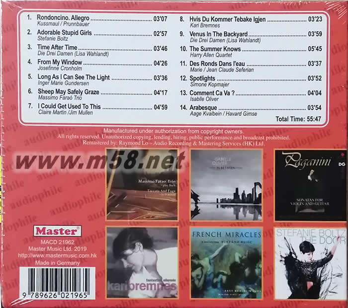 明達頂級發燒精選 MASTER SUPERIOR 2019 CD(m58.net) 每一年的《Master發燒碟》會受到音響迷期待不是沒有道理,除了精湛的選曲之外,母帶后製的用心也是有目共睹的。《Master發燒碟2019》更破天荒送到德國壓製,誓言帶給發燒友最極致的聽覺享受!專輯以大家熟悉的「弦燒樂韻」小提琴與吉他合奏的美樂開頭,接著是從爵士樂團Le Bang Bang女主唱史帝芬妮.博茲(Stefanie Boltz)的新專輯《The Door》選出的「可愛的傻女孩」,清亮的吉他搭配絕美的女聲,引您進入迷人又動聽的音響新境界。風情萬種的爵士女伶麗莎.華蘭德(Lisa Wahlandt)這次與鋼琴手Andrea Hermenau合組Die Drei Damen演繹流行金典,獲選的是第3首「一次又一次」與第9首「后院的維納斯」,鋼琴與歌聲的交織賦予經典全新面貌。瑞典女歌手約瑟芬.克隆霍爾姆(Josefine Cronholm)是二屆丹麥爵士葛萊美獎得主,唱功自是不在話下,在這里獻唱她最具代表性的「從我的窗望出去」。嗓音沙啞迷人的英格.瑪麗岡德森以獨特唱腔演唱「直到我看見光」。 日本爵士大廠Venus唱片今年也有2首入選,分別是當家樂團馬斯莫.法羅三重奏拿出改編的絕活以三重奏形式演奏巴哈的「善牧羊群」與哈利.艾倫四重奏演繹濃濃法式風情的米榭.李葛蘭作品「只有夏天知道」。英國爵士天后克萊瑪婷(Claire Martin)與吉他手Jim Mullen合作的「我會習慣的」讓人心醉神迷,來自挪威的「玫瑰仙子」凱莉.布蕾妮斯(Kari Bremnes)則以輕快動人的曲調演唱「如果你再來第巴卡」。旅居德國男歌手Jean-Claude Seferian與女兒Marie Seferian共演法國香頌經典「水中漣漪」,歌聲甜美動人的席夢.卡麥兒(Simone Kopmajer)演唱充滿復古情懷的「聚光燈」,絕美風情讓人難忘。德國豎琴家伊莎貝拉.奧利佛(Isabelle Oliver)與多位頂尖樂手以融合風格演奏一首唯美的「你好嗎?」,最后則以挪威大提琴家艾吉.瓦班(Aage Kvalbein)為法國美酒而演的「阿拉貝斯克」做為結尾,滿滿近一小時的14首精彩曲目。聽過《Master發燒碟2019》之后,您肯定會讚嘆Master Music的選曲,更會為這些優異的發燒錄音起立鼓掌!