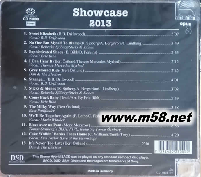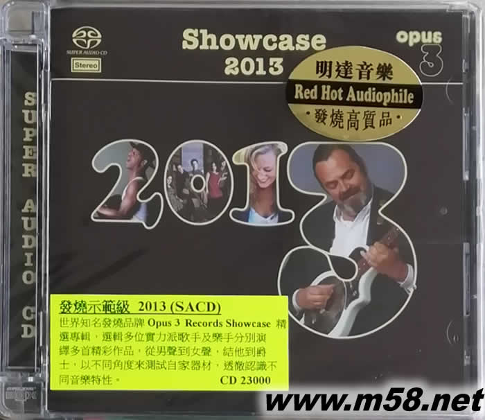 OPUS 3 作品 2013年度精選 混合層立體聲 Showcase 2013 SACD Hybrid Stereo SACD(m58.net) 世界知名發燒品牌Opus 3 Records Showcase精選專輯,選輯多位實力派歌手及樂手分別演繹多首精彩作品,從男聲到女聲,吉他到爵士,以不同角度來測試自家器材,透徹認識不同音樂特性.