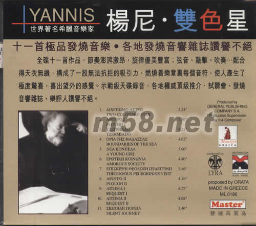 楊尼·雙色星(m58.net) 節(jié)奏澎湃氣勢激昂 旋律極度豐富 名地權威贊譽不絕 十一首極品發(fā)燒音樂·名地發(fā)燒音響雜志贊成票譽不絕 全碟十一首作品,節(jié)奏澎湃激昂,旋律優(yōu)美豐富;弦音、敲擊、吹奏…配合得天衣無縫,構成了一股無法抗拒的吸引力,燃燒著樂章里每個音符,使人產生了極度驚喜,喜出望外的感覺。示范級天碟錄音,名地權威頂級推介,試聽會、發(fā)燒音響雜志、樂評人贊譽不絕