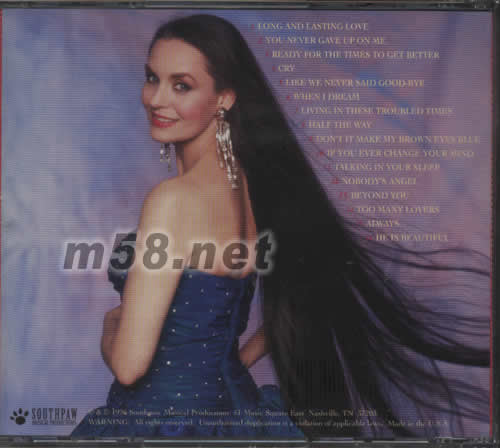 BEST OF THE BEST(m58.net) MADE IN USA CYSTAL GAYLE有著歌劇院落歌手完美的嗓音和布魯斯歌靈魂的世態家。她有高達18首冠軍單曲28首排行榜前5名歌曲。在20世紀70年代和80年代之間,她是當時鄉村音樂最炙手可熱的女手。而且她也經常獲得CMA、ACM和葛萊美大獎,1979年更成為第一位來到中國演出的鄉村音樂歌手。
