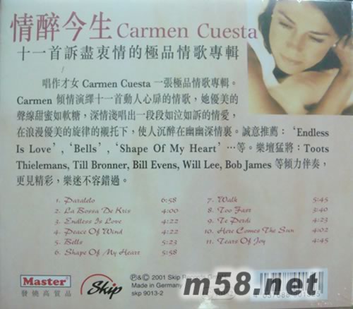 唱作才女carmen cuesta一張極品情歌專輯。carmen傾情演繹十一首動人主扉的情歌,她優美的聲線甜蜜如軟糖,深情淺唱出一段段如泣如訴的情愛,在浪漫優美的旋律的襯托下,使人沉醉在幽幽深情里,誠意推薦:'Endless is 'love.'bells','shape of my heart'...等樂壇猛將:toots thielemans,till bronner,till bronner,bill evens,will lee,bob james等傾力伴奏,更見精彩,樂迷不容錯過.
