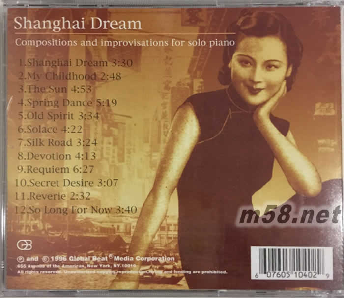 上海夢(m58.net) 這是一張關于鄉愁的專輯,在琴鍵起落的片刻,我們仿佛又回到20、30年代的上海。江天的上海夢,就像是一張美麗的水彩畫,輕輕柔柔兀自優雅的矜持著那老上海的風韻。看不完的繁華如夢,說不盡的風流傳奇,十里洋場,異國情調,而一個老舊的胭脂盒,一張斑駁的廣告畫,就足以色起對上海的幻想與思念。 江天,紐約時報曾以“驚人”“充滿色彩與活力”形容這位鋼琴家,他讓每個人都從從音樂中找到自己安身之處,牽引著懷想、浪漫、驛動的心,找尋那古早的、純真的夢境。