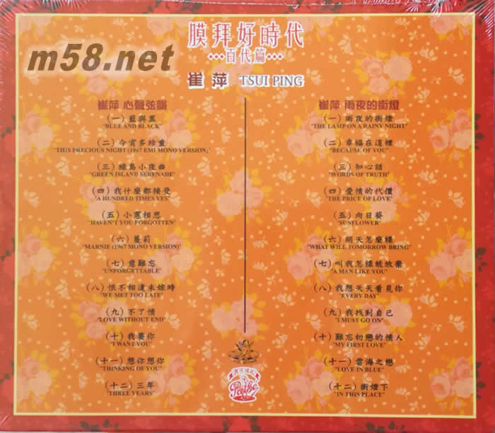 膜拜好時代 disc1.崔萍 心聲弦韻 / disc2.崔萍 雨夜的街燈 (2in1CDset)(m58.net) 環球出品 百代品質 有口皆碑 認清百代正版 品味架勢經典:《膜拜好時代》 眷戀的時代 醉人的音色 神話級偶像 EMI國語時代曲光輝重生 第二回 所有「膜拜好時代」2 in 1 CDset各附2張獨立專輯,內容完全獨立,各專輯小冊子20頁(或以上),刊有原錄音詳細資料、歌詞,部份更有當時代不同版本及設計的封面。全新文案特邀音樂評論人---Muzikland撰文,每碟不同,內容詳盡專精。