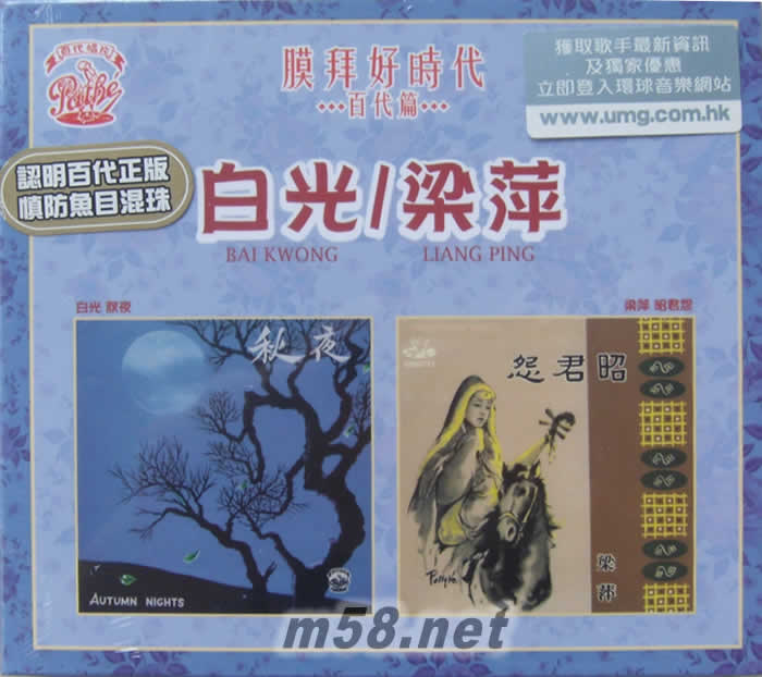 白光 / 梁萍 BAI KWONG / LIANG PING 秋夜 / 昭君怨 ( 膜拜好時代 2IN1: 百代篇 )(m58.net) 環球出品 百代品質 有口皆碑 認清百代正版 品味架勢經典:《膜拜好時代》 眷戀的時代 醉人的音色 神話級偶像 EMI國語時代曲光輝重生 第二回 所有「膜拜好時代」2 in 1 CDset各附2張獨立專輯,內容完全獨立,各專輯小冊子20頁(或以上),刊有原錄音詳細資料、歌詞,部份更有當時代不同版本及設計的封面。全新文案特邀音樂評論人---Muzikland撰文,每碟不同,內容詳盡專精。