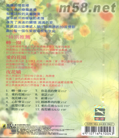 媽媽情歌 蔡幸娟 轉一圈(m58.net) 給每一位迎接新生的母親 情歌給寶寶 并獻給每一個在愛里成長的生命 融合古典音樂與流行抒情 傳遞人類生命起源的媽媽情歌