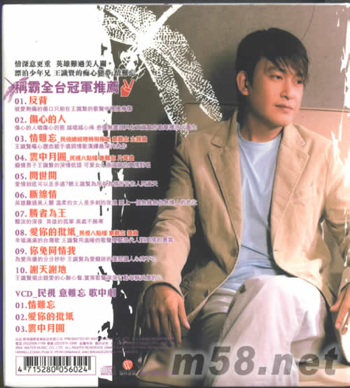 01. 反背 02. 傷心的人 03. 情難忘 -民視總經(jīng)理特別指定 意難忘 主題曲 04. 云中月圓 -民視八點檔 意難忘 片尾曲 05. 問世間 06. 斷線情 07. 勝者為王 08. 愛你的批紙 -民視八點檔 意難忘 插曲 09. 你免同情我 10. 謝天謝地 VCD 民視 意難忘 歌中劇 01. 情難忘 02. 愛你的批紙 03. 云中月圓