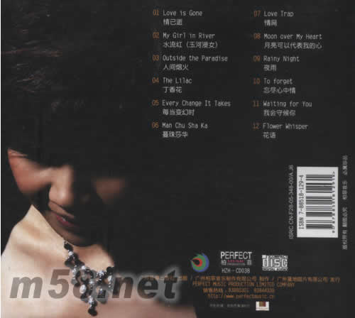 1、情已逝 2、水流紅(玉河浸女) 3、人間煙火 4、丁香花 5、每當變幻時 6、蔓珠莎華 7、情網 8、月亮可以代表我的心 9、夜雨 10、忘盡心中情 11、我會守候你 12、花語