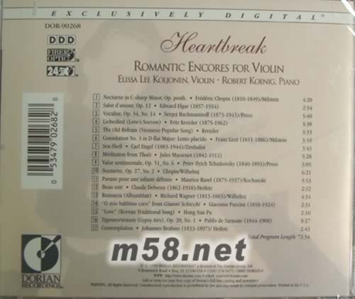 心碎HEARTBREAK(m58.net) 女提琴手伊莉莎恩琳(ELISSA LEE KOLJONEN)及鋼琴手羅勃科寧(ROBERT KOENG)攜手演繹多首優(yōu)美及耳熟能詳?shù)男√崆傩∑罚◥?ài)之悲,泰綺思暝思曲、流浪者之歌傷口之一及沈思曲等。小提琴手細(xì)致的分析力、細(xì)織的感情詮譯、與鋼琴手配合得天衣無(wú)縫。絕不能錯(cuò)過(guò)的小提琴錄音。