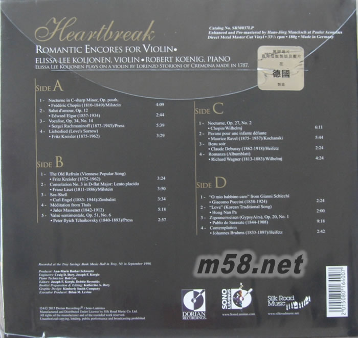 心碎 浪漫小提琴之聲Heartbreak ROMANTIC ENCORES FOR VIOLIN 雙黑膠(m58.net) Elissa Lee Koljonen (violin)、 Robert Koenig (piano) 「心碎」浪漫小提琴之聲(「Heartbreak」Romantic Encores For Violin)—叱咤發(fā)燒界及古典樂(lè)壇接近20年,被推崇為測(cè)試高級(jí)音響必備的鑑聽(tīng)專輯之一,入選<音響論壇>總編「劉漢盛CD榜單」之一,專業(yè)高級(jí)音樂(lè)界一致認(rèn)同。1999年由美國(guó)古典品牌<多里亞(Dorian)>為全美當(dāng)時(shí)得令、擁有高崇的音樂(lè)知識(shí)、才藝非凡、有「小提琴美女」之稱的女小提琴演奏家伊莉莎.李.柯莉恩琳(Elissa Lee Koljonen)所灌錄的首張個(gè)人專輯。她曾於“卡爾.費(fèi)雪小提琴大賽(Carl Flesch International)”獲得銀獎(jiǎng)、“謝霖基金會(huì)(Henryk Szeryng Foundation)”獲得小提琴演奏大獎(jiǎng)等,《巴爾的摩太陽(yáng)報(bào)(The Baltimore Sun)》以「她是近年來(lái)我聽(tīng)過(guò)最具天份的小提琴家,未來(lái)成就無(wú)可限量…」來(lái)給予好評(píng),絕對(duì)是90年代未最耀眼的小提琴之星。而柯莉恩琳於「心碎」浪漫小提琴之聲中以一把於1787年由意大利格里製琴大史托里昂尼(Lorenzo Storioni)所製、價(jià)值連城的名琴演奏,配合鋼琴家羅勃.科寧(Robert Koenig)的伴奏,完美示范了以下的古典美樂(lè)作品選: