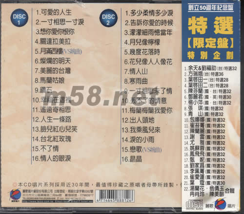 DISC 1 1、可愛的人生 2、一寸相思一寸淚 3、想你愛你恨你 4、關達拉美拉 5、月滿西樓(VS婉曲) 6、燦爛的明天 7、美麗的臺灣 8、馬蘭姑娘 9、鉆石 10、幸福在這里 11、遙遠的這里 12、人生一條路 13、臉兒紅心兒笑 14、臺北紅玫瑰 15、不了情 16、情人的眼淚 DISC 2 1、多少柔情多少淚 2、告訴你愛的時候 3、蒙蒙細雨憶當年 4、月兒像檸檬 5、幾度花落時 6、花兒像人人像花 7、情人山 8、寒雨曲 9、一寸相思未了情 10、丟不了的情意 11、梅蘭梅蘭我愛你 12、出人頭地 13、我乘風兒來 14、淚的小雨 15、戀歌(VS婉曲) 16、晶晶