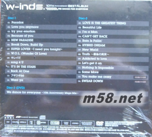 10th Anniversary Best Album SING-BEST(臺灣初回盤)(m58.net) *為了紀念w-inds.出道10週年,特別推出了依照不同音樂類型分別的紀念精選輯,要與所有喜愛w-inds.的朋友們一起回憶10年來的點滴。 *在「SING-BEST」雙CD的收錄歌曲中除了歷年來的人氣抒情歌之外,更有專輯中的人氣歌曲,除此之外在初回版和普通版各收錄了從未發表過的全新歌曲,讓所有人都能夠透過這張「SING-BEST」感受到w-inds.充滿感情的動人音樂世界。 *「SING-BEST」的封面設計也與主題相呼應而用3人帥氣的封面設計,從視覺到聽覺都要讓所有人感受到w-inds.的獨特魅力! *慶祝w-inds.出道10週年特別發行之紀念精選專輯。 *分為「DANCE-BEST」與「SING-BEST」2種不同內容,將w-inds.10年來的精彩好歌依照不同音樂類型精選收錄 *初回盤為2CD+DVD 、普通盤為2CD Only ,2種版本各收錄不同新歌、封面設計也不同。 *「SING -BEST」初回版附贈之特典DVD為10th Anniversary精彩花絮畫面,讓所有歌迷透過影像回顧w-inds.的10年歷史。