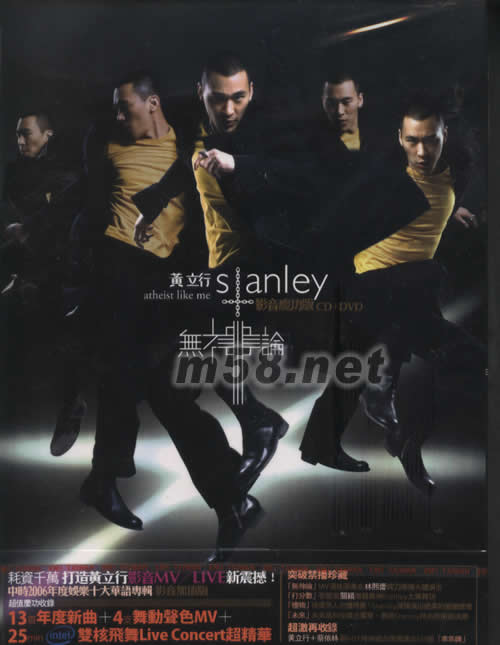 無神論(影音慶功版)(m58.net) 耗資千萬打造黃立行 影音MV/LIVE 新震撼 中時2006年度娛樂十大華語專輯 影音加值版 超值慶功收錄 13首年度新曲+4支舞動聲色MV+25min intel雙核飛舞Live Concert超精華 突破禁播珍藏 [無神論]MV 演技派美女林熙蕾跨刀激情大膽演出 [打分數]看雙面關穎激發舞神STANLEY大展舞功 [禮物]使壞男人也懂得愛!STANLEY深情演出絕美的愛戀情懷 [未來]未來高科技概念貫穿,展現STANLEY 時尚前沖新浪潮 超激再收錄 黃立行+蔡依林最HOT時尚組合現場演出SM版[乖乖牌]