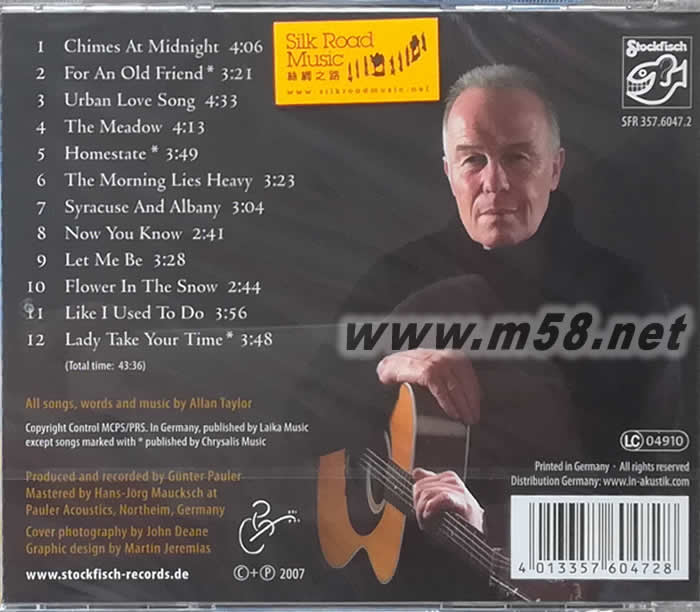 Old Friends-New Roads 舊朋友 新的路(m58.net) 被譽為最完美的唱作歌手阿倫泰勒(Allan Taylor)闊別樂壇四年后,最新專輯[舊朋友-新的路]。再次發(fā)揮吟游詩人的魅力,以其淳厚穩(wěn)重的歌聲輕輕細訴著這些年來的感受與經(jīng)歷,結他弦聲依舊清脆攝人!更首度與鋼琴大師武勒(Lutz Moller)合作,讓阿倫泰勒表現(xiàn)出最溫柔深情的一面,令您難舍難離地沉醉在他那沉實優(yōu)雅的旋律之中!