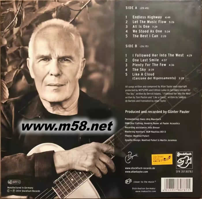 一即是全部 All Is One 180g 33RPM LP 黑膠(m58.net) 有吟游詩人之稱的完美唱作天皇阿倫.泰勒(Allan Taylor)以其沉實雄渾,感性中帶著風霜的聲線征服了不少樂迷,更被視為發燒男聲之翹楚,在其過往30多年的歌唱生涯中,創作了不少名曲,亦為他贏得無數的喝采和掌聲。泰勒相隔四年時間再度推出個人專輯大碟,接近70歲的他剛渡過人生中最嚴峻的考驗,因彈奏結他而患上肩膀嚴重的功能障礙,對深愛音樂的樂者來說這絕對是一個艱難的處境,幸好經過休養及治療,泰勒現已完全康復,與結他繼續其音樂歷奇之旅。泰勒用其一貫磁性感人的聲音,從容且帶點幽默地唱出【Endless Highway(無盡的公路)】、【Let The Music Flow(讓音樂飄浮)】、【All Is One(一即是全部)】、【We Stood As One(我們站為一體)】、【I Followed Her Into The West(我跟隨她來到西邊)】、【One Last Smile(一個最后的笑容)】、【The Sky(天空)】、【Like A Cloud(像云般)】、【The Best I Can(盡我所能)】與及【Plenty For The Few(給最多的予小眾)】,每一首歌曲都是精心雕啄、用心打造,由<老虎魚(Stockfisch)>專業錄音師悉心製作, B&W 801D 音箱鑑聽,以1:1直刻母盤、180克、33 1/3轉、處女膠製成、完全德國製造的黑膠盤推出,歌聲更為貼近原音,完美帶來泰勒人生中最具意思、最富韻味的一頁。