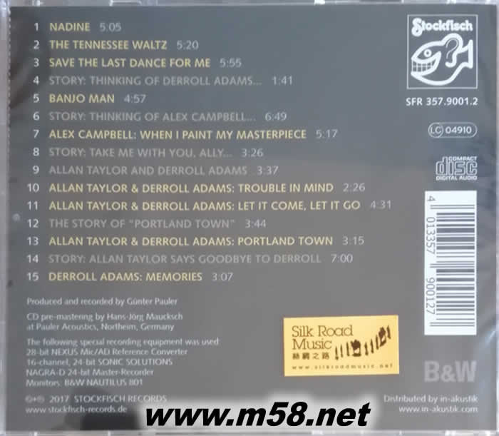 1. Nadine – Allan Taylor 2. The Tennessee Waltz – Allan Taylor 3. Save The Last Dance For Me – Allan Taylor 4. Story : Thinking of Derroll Adams… - Allan Taylor 5. Banjo Man – Allan Taylor 6. Story : Thinking of Alex Campbell… - Allan Taylor 7. When I Paint My masterpiece – Alex Campbell 8. Story : Take Me With You, Ally…. 9. Allan Taylor and Derroll Adams – Allan Taylor 10. Trouble In Mind – Allan Taylor & Derroll Adams 11. Let It Come, Let It Go – Allan Taylor & Derroll Adams 12. The Story of Portland Town – Allan Taylor 13. Portland Town – Allan Taylor & Derroll Adams 14. Story : Allan Taylor says Goodbye to Derroll 15. Memories – Derroll Adams