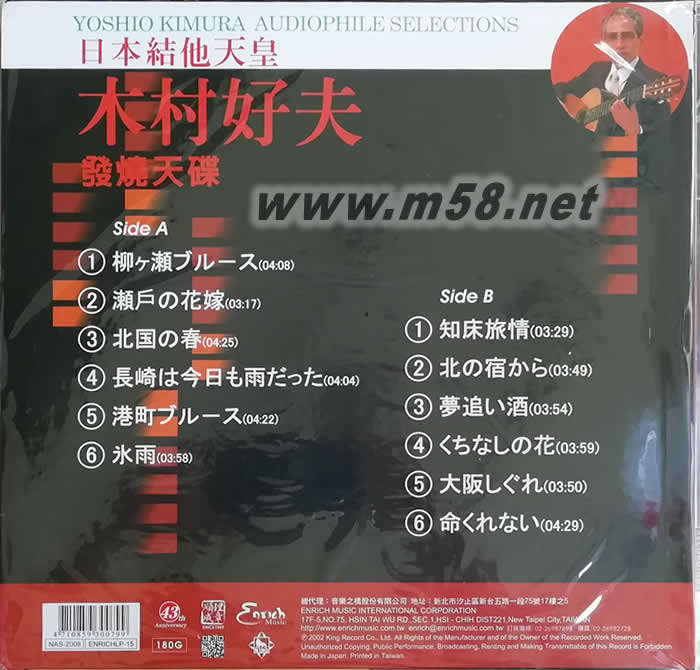 吉他天皇 發燒天碟(1)Audiophile Selections 第一集 紅色封面 黑膠(m58.net) 日本吉他天王-木村好夫的演奏技巧精湛但絕不刻意炫技,不疾不徐,盡顯一代大師的絕佳風范。King發燒級錄音效果,吉他線條呈現出清晰飽滿、晶瑩通透、飄逸輕靈的聽覺感受,可以說是吉他演奏的示范級錄音。日本地位最崇高的「吉他天皇」木村好夫,除了以精湛出色的吉他演奏技巧詮釋日本演歌獲得廣大樂迷的喜愛之外,他的編曲與演奏風格更對整個亞洲音樂的發展具有關鍵性的影響,木村好夫的演奏早已成為一個時代的共同回憶。在許多老資格的發燒友心中,木村好夫更是「發燒」的代名詞,只要是他的專輯必定是錄音絕佳的作品。許多知名的吉他演奏家經常是以表現高難度的演奏技巧來讓人折服,木村好夫則不然,他總是步調優雅不疾不徐,表現輕快愉悅的曲子時不會顯得過動浮躁;詮釋抒情優美的歌曲則沒有太多的憂傷煽情。這張由 Enrich Music 發行的精選大碟,收錄了樂迷們最耳熟的「柳瀬藍調」、「瀨戶之新娘」、「北國之春」、「港町藍調」等十五首經典演出,特別取得日本 King Music 原始母帶精心製作,音質純凈,並以全新的豪華紙板硬殼包裝,更顯珍藏的價值。在整張精選集錄音中,吉他的音色通透自然、清晰明亮而又溫暖飽滿,將這些宛如星空中最閃亮的星光一般的經典演繹得更加不朽!