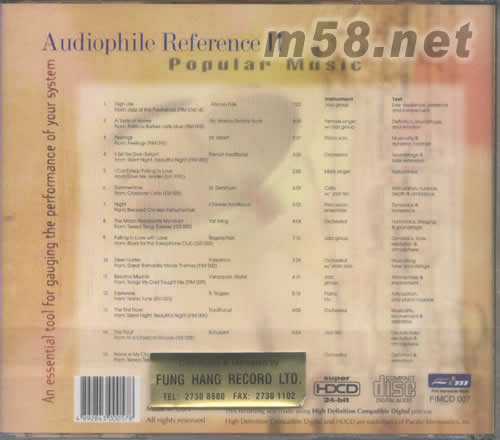 監聽天碟II流行音樂 POPULAR MUSIC(m58.net) FLM 007聆聽天碟II流行音樂,精心挑選15首敞錄音輯自[當鋪爵士],全部、藍調咖啡、爸爸教我的歌、等到經典上榜名稱;并在內詳列每段如何測試音樂系統之各種不同性能。此碟用session tape重新裝模,效果比原碟更靚聲,不妨比較。聆聽或欣賞,