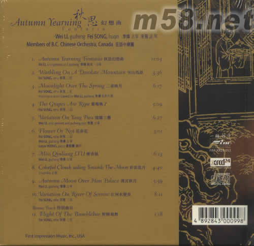 秋思幻想 XRCD(m58.net) Autumn Yearning Fantasia [秋思幻想曲] 李煒-古箏 宋飛-胡琴 發燒名牌FIM中樂系列繼[平湖秋月]、[絲竹管弦]及[江河水]后本年度又一經典杰作[秋思幻想曲],已率先被[國際音響工作師協會]選定為今年六月舉行之研討會主題[新真理]之示范錄音,也被180位來自世界各地之音響專業人士,認為是[前無古人]的最佳現場表現制作!